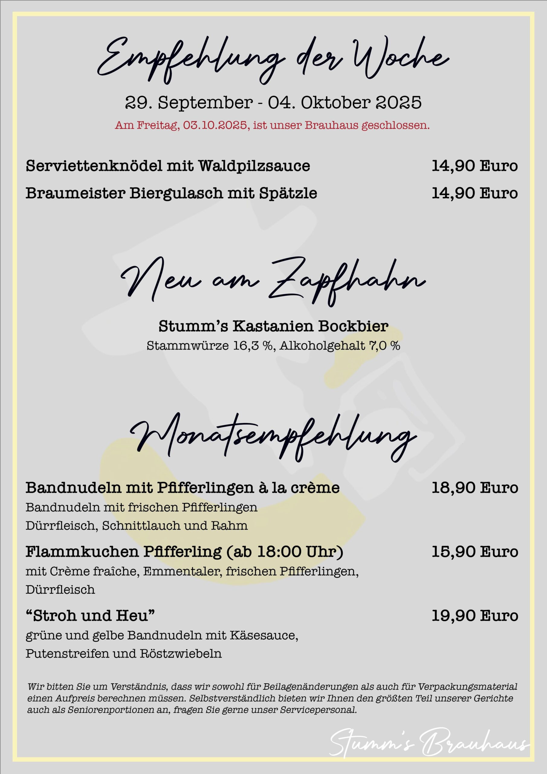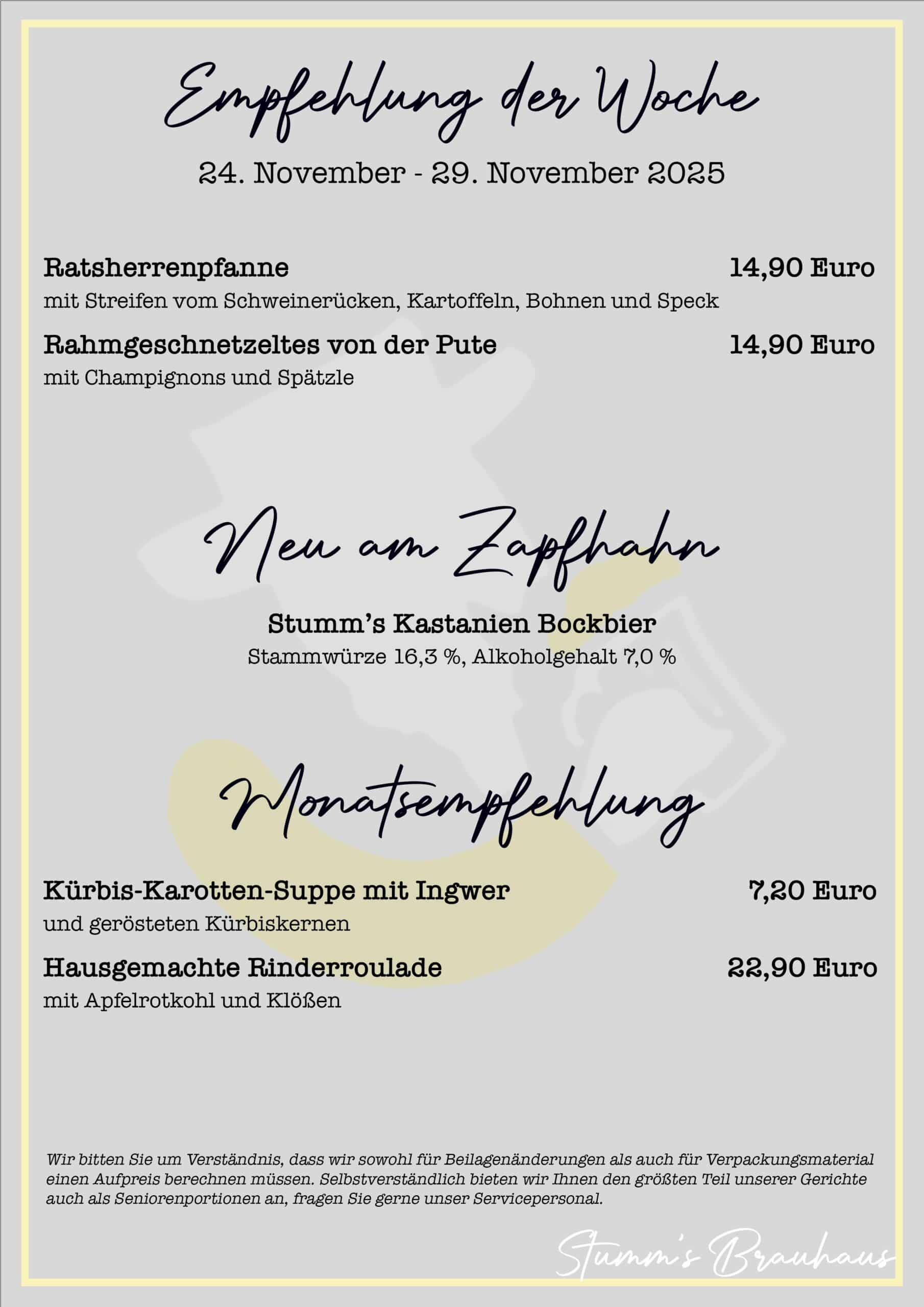 Empfehlung Empfehlung der Woche STUMM’S – GENUSS – BRAUHAUS in Neunkirchen am Wasserturm! Jetzt telefonisch einen Tisch reservieren Tolle wöchentlich wechselnde Empfehlungen der Woche! Kehren Sie ein und geniessen Sie auf unkomplizierte Art und Weise ein Stück saarländische Tradition. Zur Empfehlung KW 48 - 24.11. - 29.11.2025 Zur Empfehlung KW 40 - 29.09. - 04.10.2025 Mittagstisch-Angebote jede Woche per E-Mail?