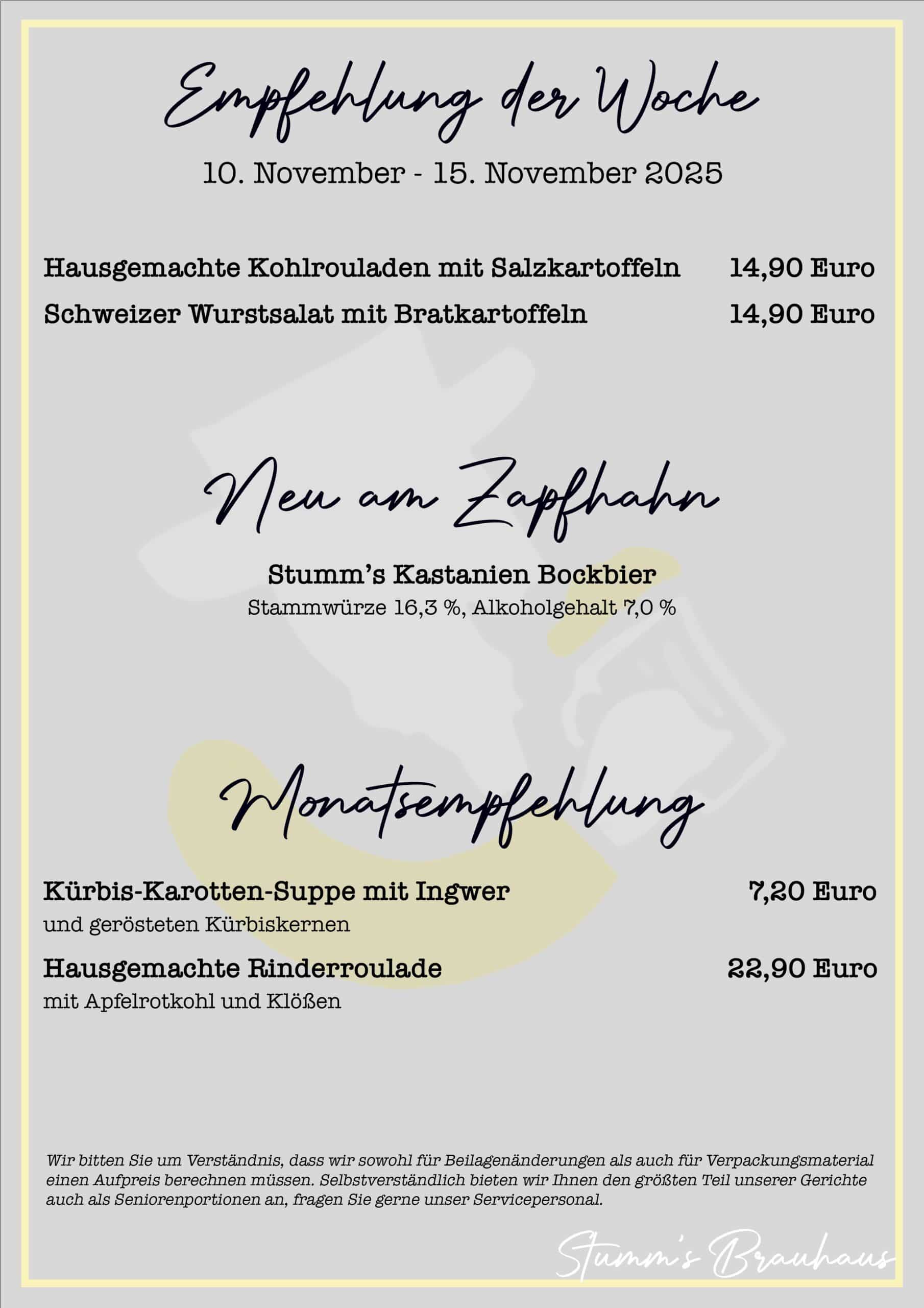 Empfehlung Empfehlung der Woche STUMM’S – GENUSS – BRAUHAUS in Neunkirchen am Wasserturm! Jetzt telefonisch einen Tisch reservieren Tolle wöchentlich wechselnde Empfehlungen der Woche! Kehren Sie ein und geniessen Sie auf unkomplizierte Art und Weise ein Stück saarländische Tradition. Zur Empfehlung KW 46 - 10.11. - 15.11.2025 Zur Empfehlung KW 40 - 29.09. - 04.10.2025 Mittagstisch-Angebote jede Woche per E-Mail?