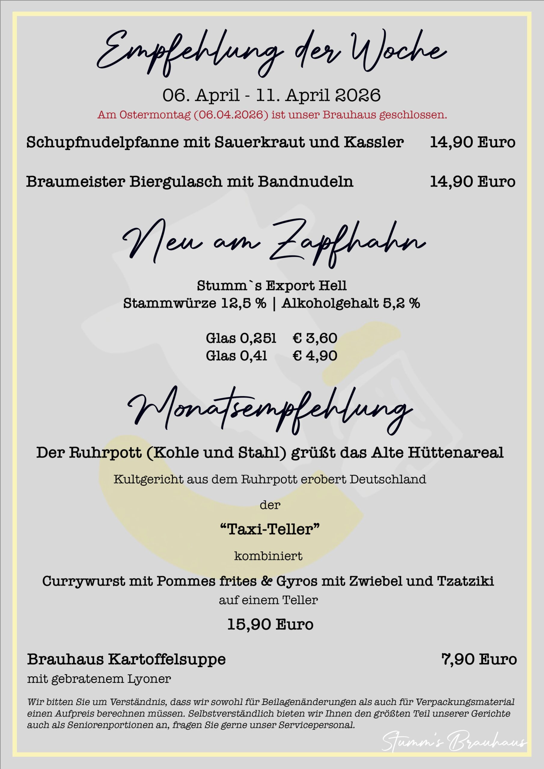Empfehlung Empfehlung der Woche STUMM’S – GENUSS – BRAUHAUS in Neunkirchen am Wasserturm! Jetzt telefonisch einen Tisch reservieren Tolle wöchentlich wechselnde Empfehlungen der Woche! Kehren Sie ein und geniessen Sie auf unkomplizierte Art und Weise ein Stück saarländische Tradition. Zur Empfehlung KW 17 - 20.04. - 25.04.2026 Zur Empfehlung KW 15 - 06.04. - 11.04.2026 Mittagstisch-Angebote jede Woche per E-Mail?